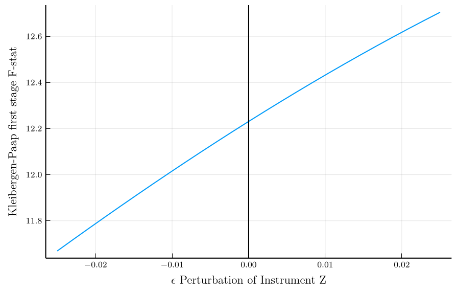 "\nF-statistics estimated with ivreg2 and ϵ-perturbed instruments: F = " * @sprintf("%.2f", dfOut.Feps[1]);